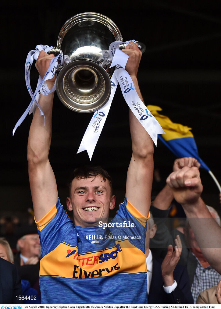 26 August 2018; Tipperary captain Colin English lifts the James Nowlan Cup after the Bord Gais Energy GAA Hurling All-Ireland U21 Championship Final match between Cork and Tipperary at the Gaelic Grounds in Limerick. Photo by Piaras Ó Mídheach/Sportsfile