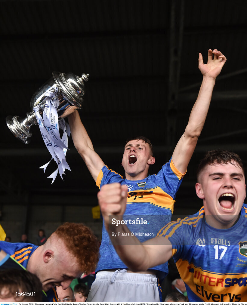 26 August 2018; Tipperary captain Colin English lifts the James Nowlan Cup after the Bord Gais Energy GAA Hurling All-Ireland U21 Championship Final match between Cork and Tipperary at the Gaelic Grounds in Limerick. Photo by Piaras Ó Mídheach/Sportsfile