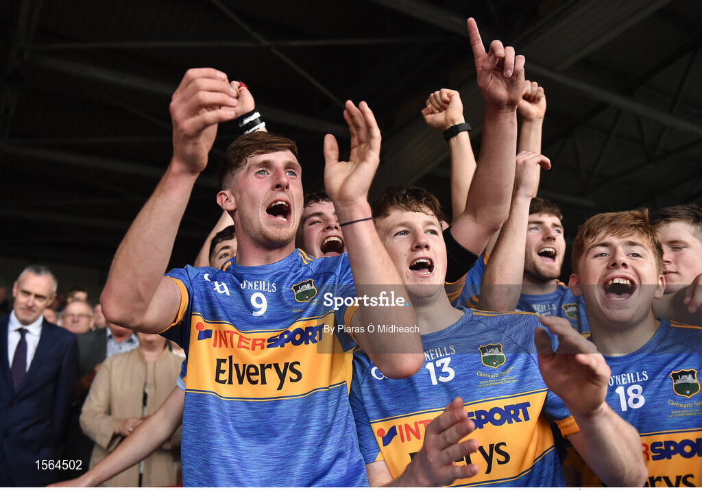 26 August 2018; Tipperary players, from left, Ger Browne, Jake Morris, and Lyndon Fairbrother celebrate after the Bord Gais Energy GAA Hurling All-Ireland U21 Championship Final match between Cork and Tipperary at the Gaelic Grounds in Limerick. Photo by Piaras Ó Mídheach/Sportsfile