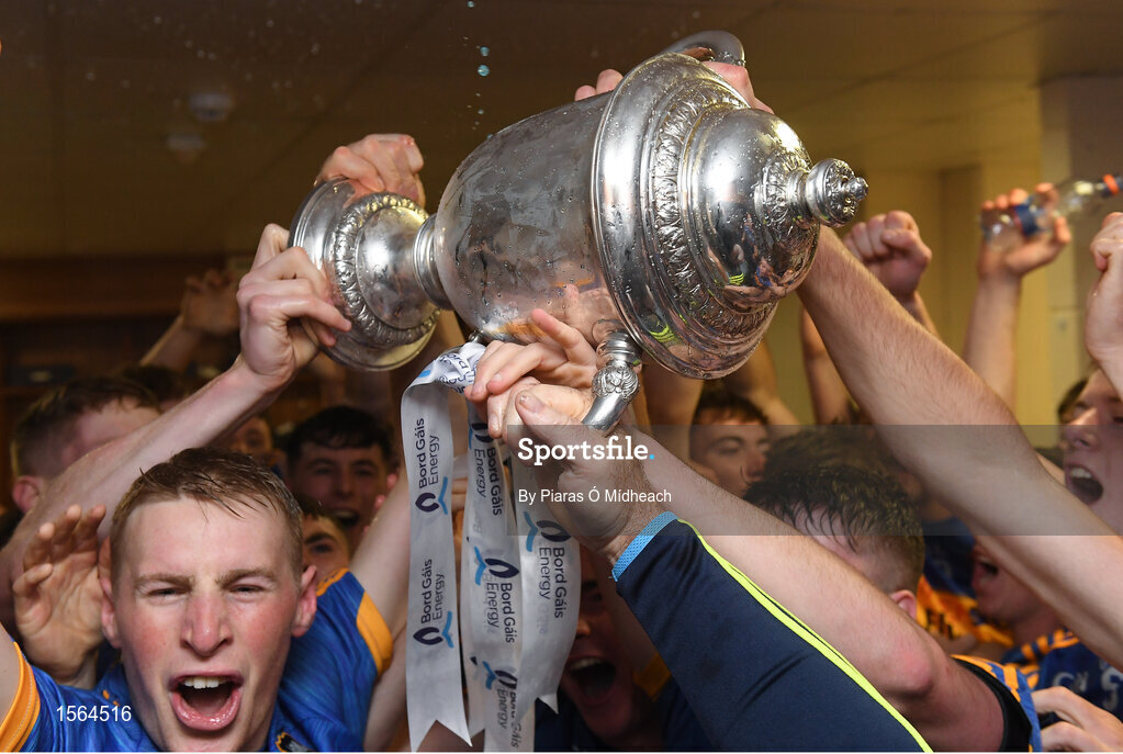 26 August 2018; Tipperary players, including Brian McGrath, left, celebrate with the James Nowlan Cup after the Bord Gais Energy GAA Hurling All-Ireland U21 Championship Final match between Cork and Tipperary at the Gaelic Grounds in Limerick. Photo by Piaras Ó Mídheach/Sportsfile