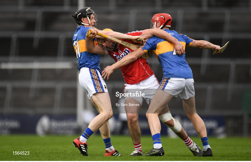 26 August 2018; Declan Dalton of Cork in action against Jerome Cahill, left, and Dillon Quirke of Tipperary during the Bord Gais Energy GAA Hurling All-Ireland U21 Championship Final match between Cork and Tipperary at the Gaelic Grounds in Limerick. Photo by Sam Barnes/Sportsfile