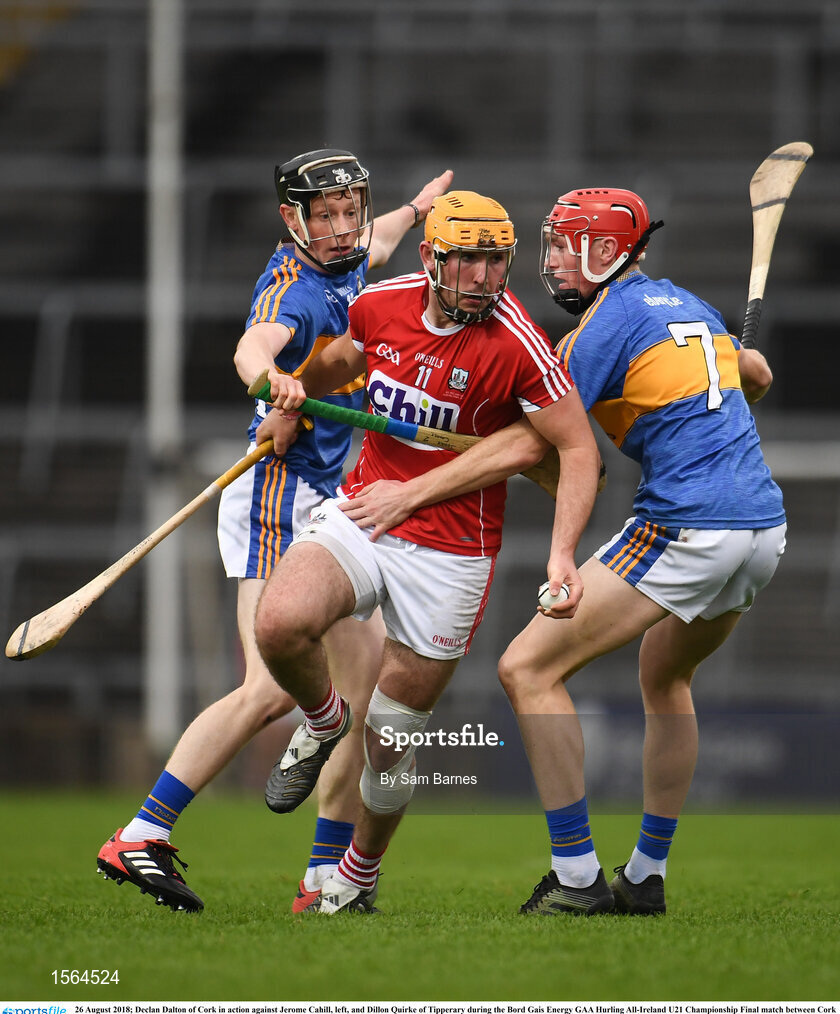 26 August 2018; Declan Dalton of Cork in action against Jerome Cahill, left, and Dillon Quirke of Tipperary during the Bord Gais Energy GAA Hurling All-Ireland U21 Championship Final match between Cork and Tipperary at the Gaelic Grounds in Limerick. Photo by Sam Barnes/Sportsfile