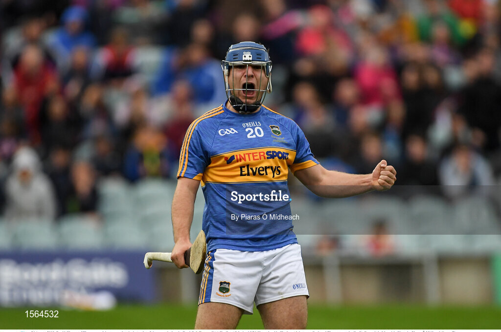 26 August 2018; David Gleeson of Tipperary celebrates scoring the last point of the game during the Bord Gais Energy GAA Hurling All-Ireland U21 Championship Final match between Cork and Tipperary at the Gaelic Grounds in Limerick. Photo by Piaras Ó Mídheach/Sportsfile