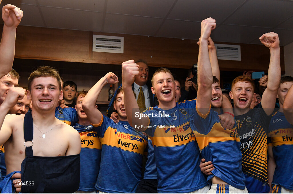 26 August 2018; Brian McGrath of Tipperary, centre, and his team-mates celebrate in the dressing room after the Bord Gais Energy GAA Hurling All-Ireland U21 Championship Final match between Cork and Tipperary at the Gaelic Grounds in Limerick. Photo by Piaras Ó Mídheach/Sportsfile