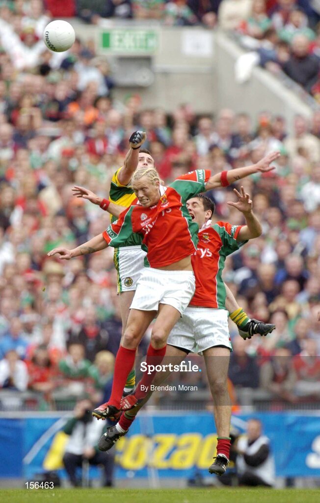 26 September 2004; William Kirby, Kerry, in action against Ciaran McDonald and Fergal Kelly, Mayo. Bank of Ireland All-Ireland Senior Football Championship Final, Kerry v Mayo, Croke Park, Dublin. Picture credit; Brendan Moran / SPORTSFILE *** Local Caption *** Any photograph taken by SPORTSFILE during, or in connection with, the 2004 Bank of Ireland All-Ireland Senior Football Final which displays GAA logos or contains an image or part of an image of any GAA intellectual property, or, which contains images of a GAA player/players in their playing uniforms, may only be used for editorial and non-advertising purposes. Use of photographs for advertising, as posters or for purchase separately is strictly prohibited unless prior written approval has been obtained from the Gaelic Athletic Association.