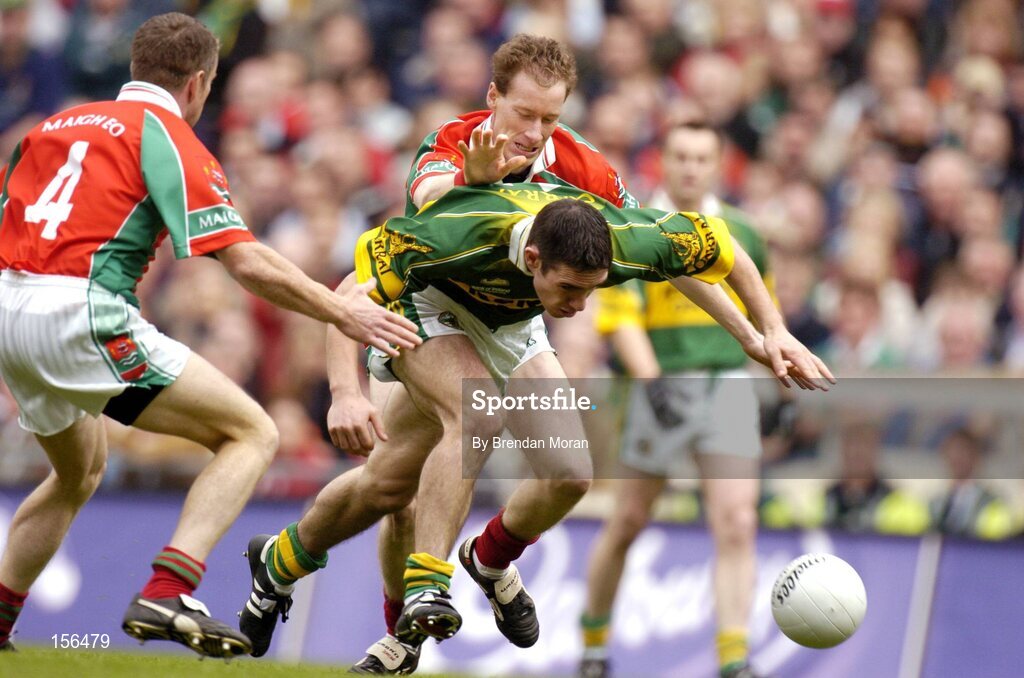 26 September 2004; Declan O'Sullivan, Kerry, in action against Gary Ruane (4) and James Nallen, Mayo. Bank of Ireland All-Ireland Senior Football Championship Final, Kerry v Mayo, Croke Park, Dublin. Picture credit; Brendan Moran / SPORTSFILE *** Local Caption *** Any photograph taken by SPORTSFILE during, or in connection with, the 2004 Bank of Ireland All-Ireland Senior Football Final which displays GAA logos or contains an image or part of an image of any GAA intellectual property, or, which contains images of a GAA player/players in their playing uniforms, may only be used for editorial and non-advertising purposes. Use of photographs for advertising, as posters or for purchase separately is strictly prohibited unless prior written approval has been obtained from the Gaelic Athletic Association.