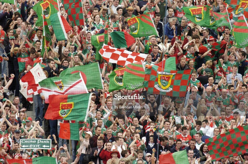 26 September 2004; Mayo fans cheer on their side from Hill 16. Bank of Ireland All-Ireland Senior Football Championship Final, Kerry v Mayo, Croke Park, Dublin. Picture credit; Brendan Moran / SPORTSFILE *** Local Caption *** Any photograph taken by SPORTSFILE during, or in connection with, the 2004 Bank of Ireland All-Ireland Senior Football Final which displays GAA logos or contains an image or part of an image of any GAA intellectual property, or, which contains images of a GAA player/players in their playing uniforms, may only be used for editorial and non-advertising purposes. Use of photographs for advertising, as posters or for purchase separately is strictly prohibited unless prior written approval has been obtained from the Gaelic Athletic Association.
