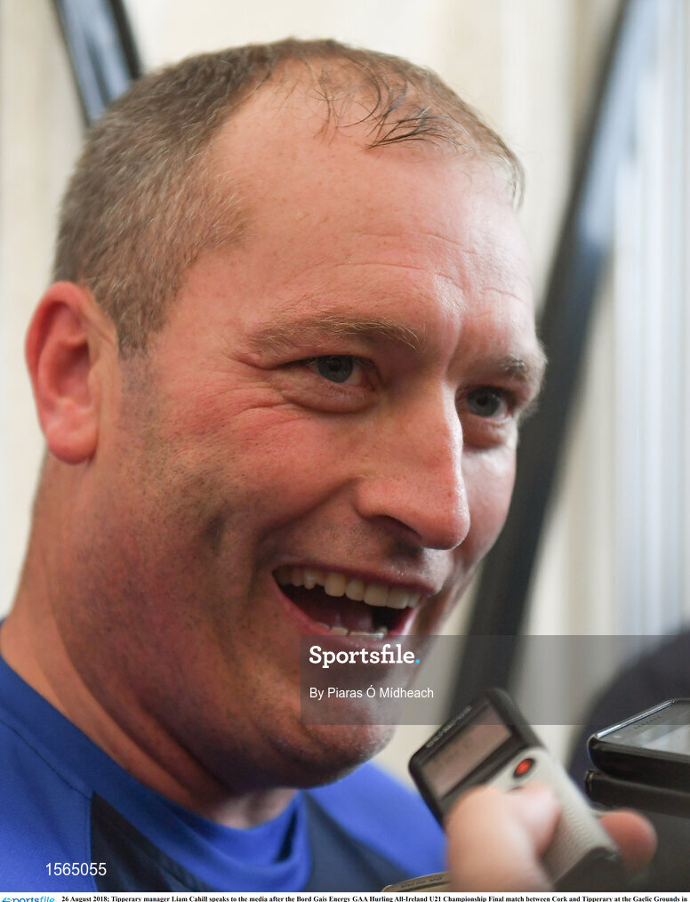 26 August 2018; Tipperary manager Liam Cahill speaks to the media after the Bord Gais Energy GAA Hurling All-Ireland U21 Championship Final match between Cork and Tipperary at the Gaelic Grounds in Limerick. Photo by Piaras Ó Mídheach/Sportsfile