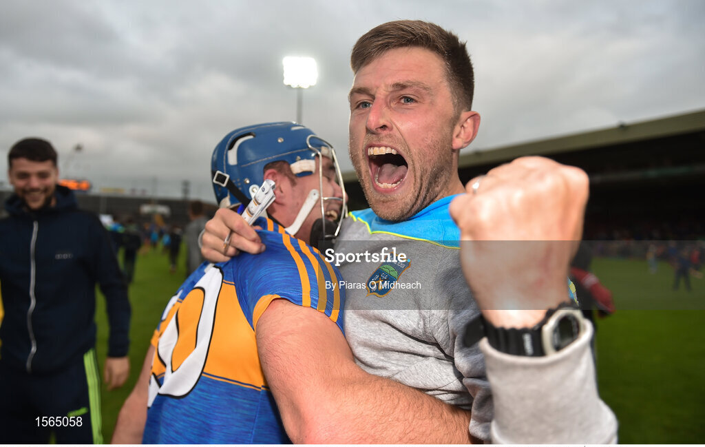 26 August 2018; Former Tipperary senior hurler Shane McGrath celebrates with David Gleeson of Tipperary after the Bord Gais Energy GAA Hurling All-Ireland U21 Championship Final match between Cork and Tipperary at the Gaelic Grounds in Limerick. Photo by Piaras Ó Mídheach/Sportsfile