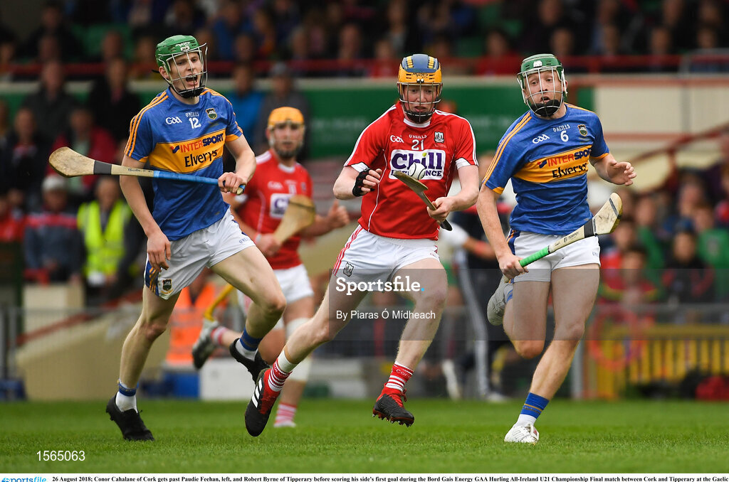 26 August 2018; Conor Cahalane of Cork gets past Paudie Feehan, left, and Robert Byrne of Tipperary before scoring his side's first goal during the Bord Gais Energy GAA Hurling All-Ireland U21 Championship Final match between Cork and Tipperary at the Gaelic Grounds in Limerick. Photo by Piaras Ó Mídheach/Sportsfile
