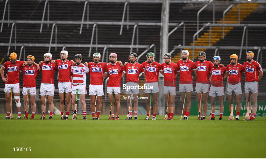 26 August 2018; The Cork team stand for the national anthem ahead of the Bord Gais Energy GAA Hurling All-Ireland U21 Championship Final match between Cork and Tipperary at the Gaelic Grounds in Limerick. Photo by Sam Barnes/Sportsfile