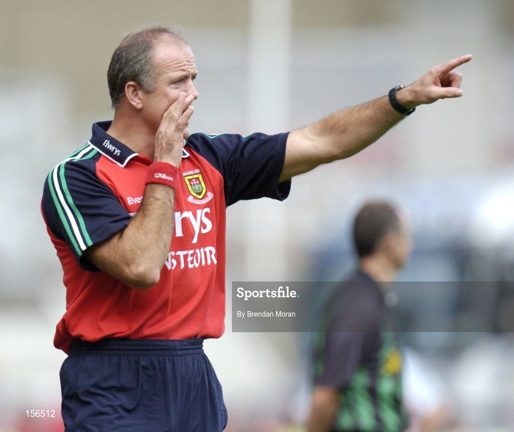 26 September 2004; Mayo manager John Maughan issues instructions to his players during the game. Bank of Ireland All-Ireland Senior Football Championship Final, Kerry v Mayo, Croke Park, Dublin. Picture credit; Brendan Moran / SPORTSFILE *** Local Caption *** Any photograph taken by SPORTSFILE during, or in connection with, the 2004 Bank of Ireland All-Ireland Senior Football Final which displays GAA logos or contains an image or part of an image of any GAA intellectual property, or, which contains images of a GAA player/players in their playing uniforms, may only be used for editorial and non-advertising purposes. Use of photographs for advertising, as posters or for purchase separately is strictly prohibited unless prior written approval has been obtained from the Gaelic Athletic Association.