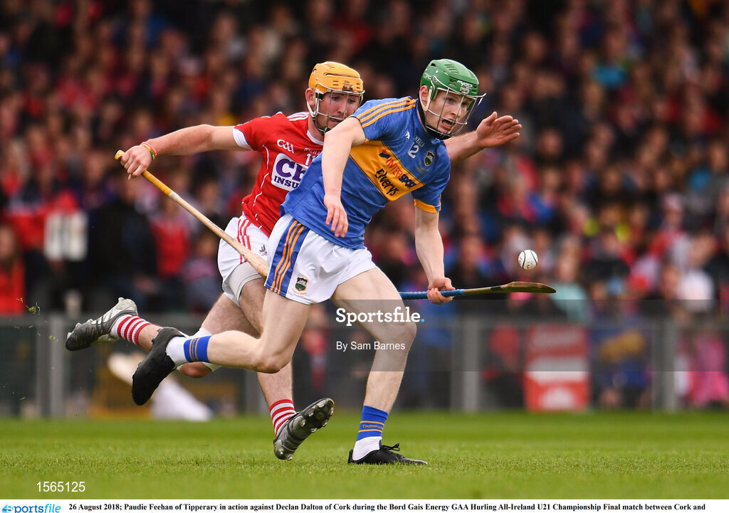 26 August 2018; Paudie Feehan of Tipperary in action against Declan Dalton of Cork during the Bord Gais Energy GAA Hurling All-Ireland U21 Championship Final match between Cork and Tipperary at the Gaelic Grounds in Limerick. Photo by Sam Barnes/Sportsfile