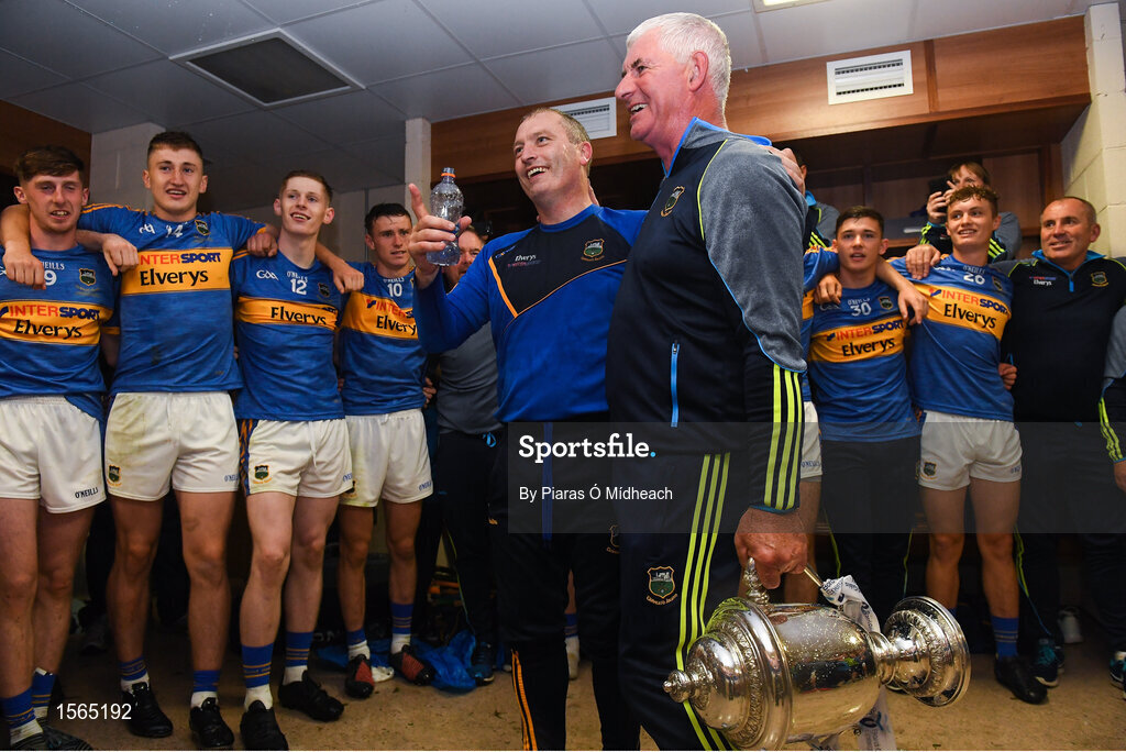 26 August 2018; Tipperary manager Liam Cahill, left, and selector John Sheedy celebrate with the the James Nowlan Cup with their players in the dressing room after the Bord Gais Energy GAA Hurling All-Ireland U21 Championship Final match between Cork and Tipperary at the Gaelic Grounds in Limerick. Photo by Piaras Ó Mídheach/Sportsfile