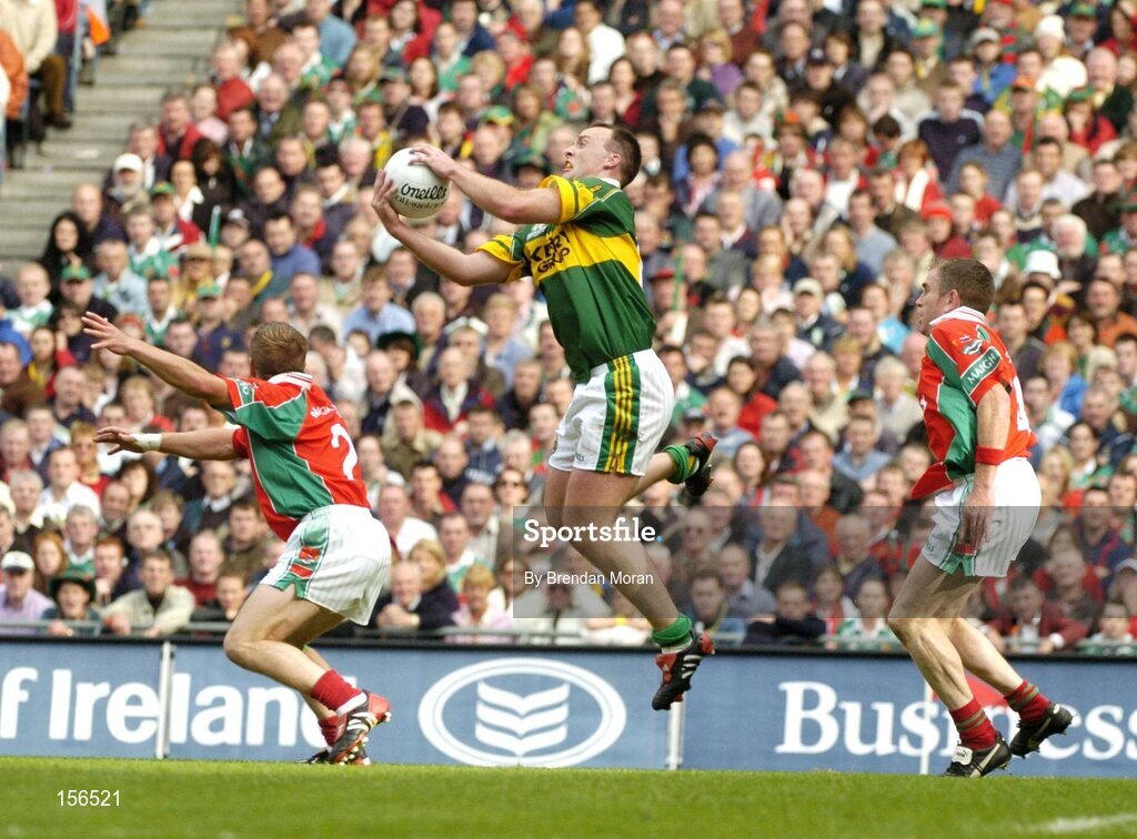 26 September 2004; John Crowley, Kerry, fields a high ball in between Dermot Geraghty, left, and Gary Ruane, Mayo. Bank of Ireland All-Ireland Senior Football Championship Final, Kerry v Mayo, Croke Park, Dublin. Picture credit; Brendan Moran / SPORTSFILE *** Local Caption *** Any photograph taken by SPORTSFILE during, or in connection with, the 2004 Bank of Ireland All-Ireland Senior Football Final which displays GAA logos or contains an image or part of an image of any GAA intellectual property, or, which contains images of a GAA player/players in their playing uniforms, may only be used for editorial and non-advertising purposes. Use of photographs for advertising, as posters or for purchase separately is strictly prohibited unless prior written approval has been obtained from the Gaelic Athletic Association.