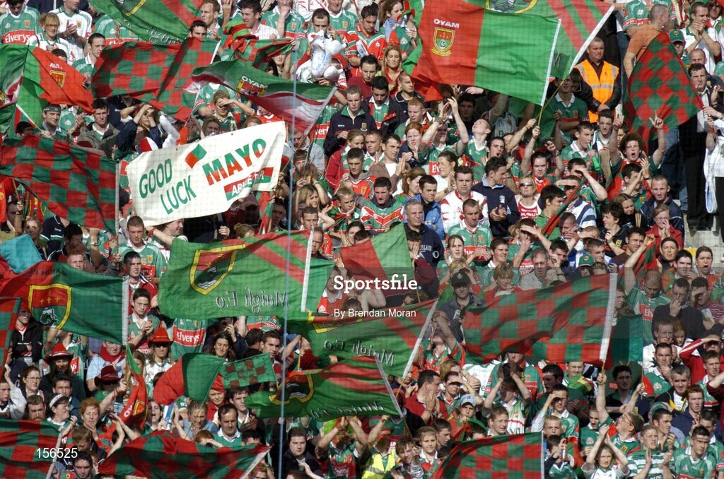 26 September 2004; Mayo fans cheer on their side during the game. Bank of Ireland All-Ireland Senior Football Championship Final, Kerry v Mayo, Croke Park, Dublin. Picture credit; Brendan Moran / SPORTSFILE *** Local Caption *** Any photograph taken by SPORTSFILE during, or in connection with, the 2004 Bank of Ireland All-Ireland Senior Football Final which displays GAA logos or contains an image or part of an image of any GAA intellectual property, or, which contains images of a GAA player/players in their playing uniforms, may only be used for editorial and non-advertising purposes. Use of photographs for advertising, as posters or for purchase separately is strictly prohibited unless prior written approval has been obtained from the Gaelic Athletic Association.