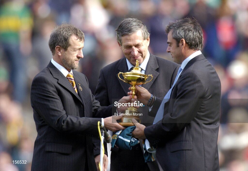 26 September 2004; President of the GAA Sean Kelly, left, and Liam Mulvihill, Ard Stiurthoir of the GAA, admire the Ryder Cup won by Europe last weekend by Irish golfer and European team member Paul McGinley. Bank of Ireland All-Ireland Senior Football Championship Final, Kerry v Mayo, Croke Park, Dublin. Picture credit; Brendan Moran / SPORTSFILE *** Local Caption *** Any photograph taken by SPORTSFILE during, or in connection with, the 2004 Bank of Ireland All-Ireland Senior Football Final which displays GAA logos or contains an image or part of an image of any GAA intellectual property, or, which contains images of a GAA player/players in their playing uniforms, may only be used for editorial and non-advertising purposes. Use of photographs for advertising, as posters or for purchase separately is strictly prohibited unless prior written approval has been obtained from the Gaelic Athletic Association.