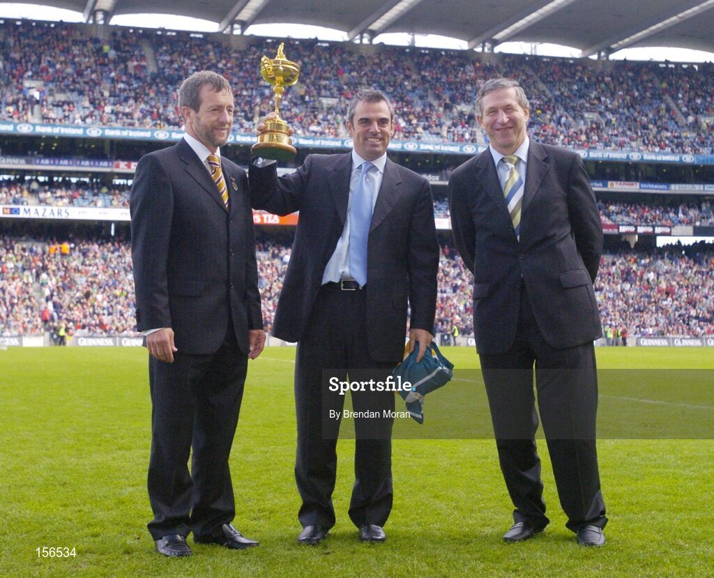 26 September 2004; President of the GAA Sean Kelly, left, and Liam Mulvihill, Ard Stiurthoir of the GAA, with Irish golfer Paul McGinley and the Ryder Cup won by Europe last weekend. Bank of Ireland All-Ireland Senior Football Championship Final, Kerry v Mayo, Croke Park, Dublin. Picture credit; Brendan Moran / SPORTSFILE *** Local Caption *** Any photograph taken by SPORTSFILE during, or in connection with, the 2004 Bank of Ireland All-Ireland Senior Football Final which displays GAA logos or contains an image or part of an image of any GAA intellectual property, or, which contains images of a GAA player/players in their playing uniforms, may only be used for editorial and non-advertising purposes. Use of photographs for advertising, as posters or for purchase separately is strictly prohibited unless prior written approval has been obtained from the Gaelic Athletic Association.