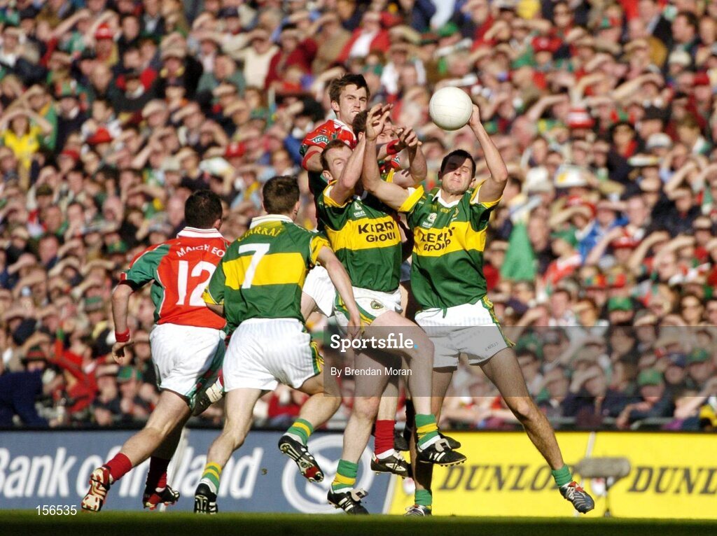 26 September 2004; Eoin Brosnan, right, and Liam Hassett, Kerry, contest a high ball with Ronan McGarrity and James Nallen, Mayo, as Alan Dillon (12), Mayo, and Marc O Se (5), Kerry await the break. Bank of Ireland All-Ireland Senior Football Championship Final, Kerry v Mayo, Croke Park, Dublin. Picture credit; Brendan Moran / SPORTSFILE *** Local Caption *** Any photograph taken by SPORTSFILE during, or in connection with, the 2004 Bank of Ireland All-Ireland Senior Football Final which displays GAA logos or contains an image or part of an image of any GAA intellectual property, or, which contains images of a GAA player/players in their playing uniforms, may only be used for editorial and non-advertising purposes. Use of photographs for advertising, as posters or for purchase separately is strictly prohibited unless prior written approval has been obtained from the Gaelic Athletic Association.