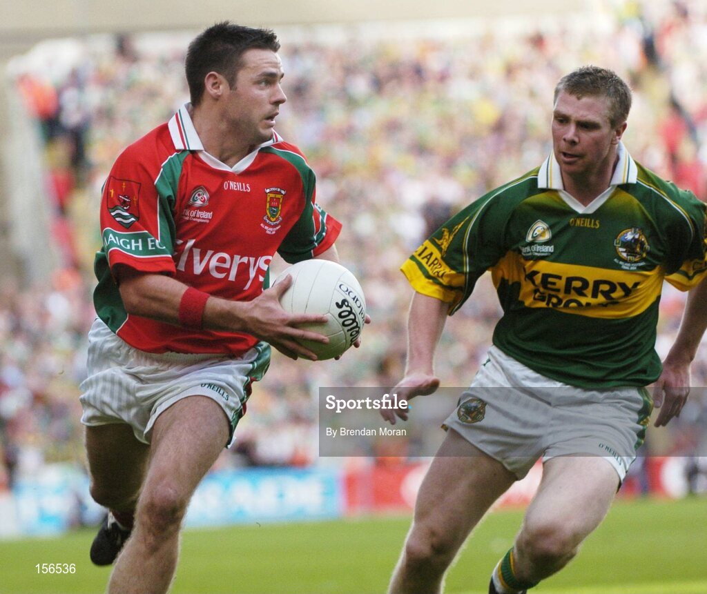 26 September 2004; Brian Maloney, Mayo, in action against Tomas O Se, Kerry. Bank of Ireland All-Ireland Senior Football Championship Final, Kerry v Mayo, Croke Park, Dublin. Picture credit; Brendan Moran / SPORTSFILE *** Local Caption *** Any photograph taken by SPORTSFILE during, or in connection with, the 2004 Bank of Ireland All-Ireland Senior Football Final which displays GAA logos or contains an image or part of an image of any GAA intellectual property, or, which contains images of a GAA player/players in their playing uniforms, may only be used for editorial and non-advertising purposes. Use of photographs for advertising, as posters or for purchase separately is strictly prohibited unless prior written approval has been obtained from the Gaelic Athletic Association.