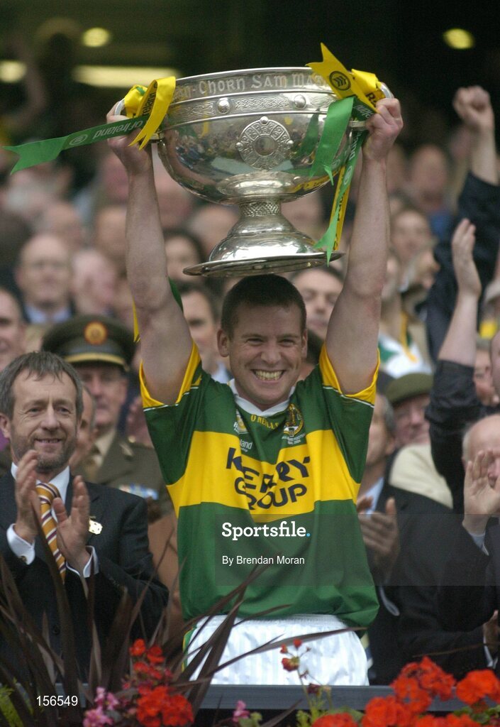 26 September 2004; Kerry captain Dara O Cinneide lifts the Sam Maguire cup in the company of President of the GAA Sean Kelly, left. Bank of Ireland All-Ireland Senior Football Championship Final, Kerry v Mayo, Croke Park, Dublin. Picture credit; Brendan Moran / SPORTSFILE *** Local Caption *** Any photograph taken by SPORTSFILE during, or in connection with, the 2004 Bank of Ireland All-Ireland Senior Football Final which displays GAA logos or contains an image or part of an image of any GAA intellectual property, or, which contains images of a GAA player/players in their playing uniforms, may only be used for editorial and non-advertising purposes. Use of photographs for advertising, as posters or for purchase separately is strictly prohibited unless prior written approval has been obtained from the Gaelic Athletic Association.