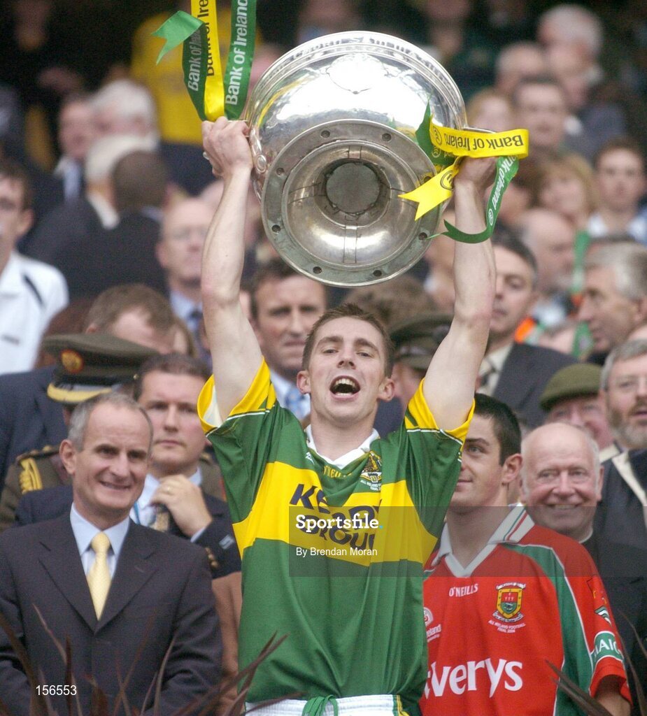 26 September 2004; Kerry's Marc O Se lifts the Sam Maguire cup after the game. Bank of Ireland All-Ireland Senior Football Championship Final, Kerry v Mayo, Croke Park, Dublin. Picture credit; Brendan Moran / SPORTSFILE *** Local Caption *** Any photograph taken by SPORTSFILE during, or in connection with, the 2004 Bank of Ireland All-Ireland Senior Football Final which displays GAA logos or contains an image or part of an image of any GAA intellectual property, or, which contains images of a GAA player/players in their playing uniforms, may only be used for editorial and non-advertising purposes. Use of photographs for advertising, as posters or for purchase separately is strictly prohibited unless prior written approval has been obtained from the Gaelic Athletic Association.