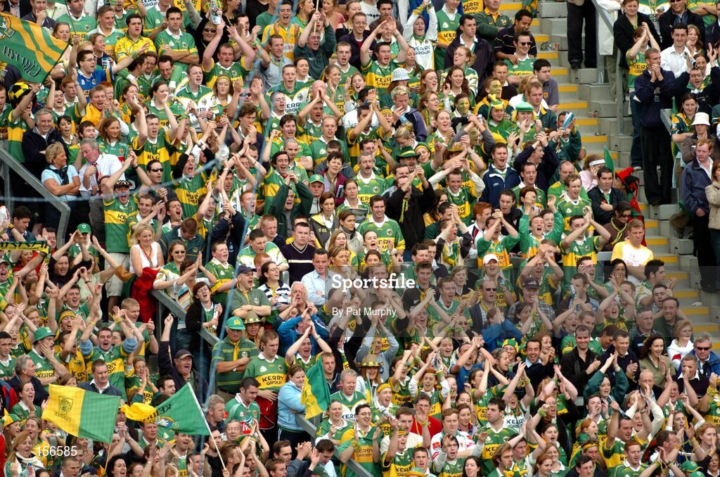 26 September 2004; Kerry supporters cheer on their side. Bank of Ireland All-Ireland Senior Football Championship Final, Kerry v Mayo, Croke Park, Dublin. Picture credit; Pat Murphy / SPORTSFILE *** Local Caption *** Any photograph taken by SPORTSFILE during, or in connection with, the 2004 Bank of Ireland All-Ireland Senior Football Final which displays GAA logos or contains an image or part of an image of any GAA intellectual property, or, which contains images of a GAA player/players in their playing uniforms, may only be used for editorial and non-advertising purposes. Use of photographs for advertising, as posters or for purchase separately is strictly prohibited unless prior written approval has been obtained from the Gaelic Athletic Association.