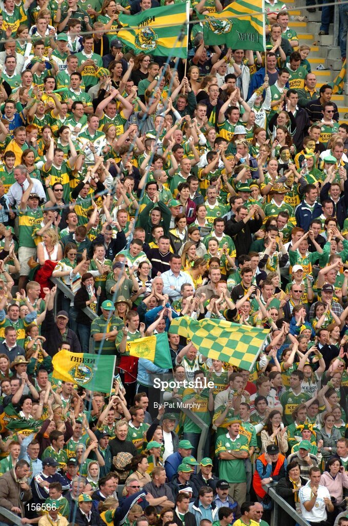 26 September 2004; Kerry supporters cheer on their side. Bank of Ireland All-Ireland Senior Football Championship Final, Kerry v Mayo, Croke Park, Dublin. Picture credit; Pat Murphy / SPORTSFILE *** Local Caption *** Any photograph taken by SPORTSFILE during, or in connection with, the 2004 Bank of Ireland All-Ireland Senior Football Final which displays GAA logos or contains an image or part of an image of any GAA intellectual property, or, which contains images of a GAA player/players in their playing uniforms, may only be used for editorial and non-advertising purposes. Use of photographs for advertising, as posters or for purchase separately is strictly prohibited unless prior written approval has been obtained from the Gaelic Athletic Association.