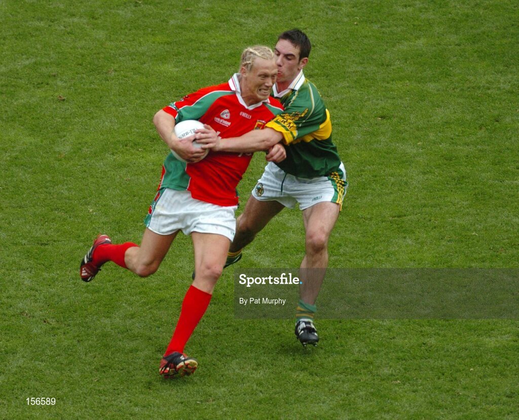 26 September 2004; Ciaran McDonald, Mayo, in action against Declan O'Sullivan, Kerry. Bank of Ireland All-Ireland Senior Football Championship Final, Kerry v Mayo, Croke Park, Dublin. Picture credit; Pat Murphy / SPORTSFILE *** Local Caption *** Any photograph taken by SPORTSFILE during, or in connection with, the 2004 Bank of Ireland All-Ireland Senior Football Final which displays GAA logos or contains an image or part of an image of any GAA intellectual property, or, which contains images of a GAA player/players in their playing uniforms, may only be used for editorial and non-advertising purposes. Use of photographs for advertising, as posters or for purchase separately is strictly prohibited unless prior written approval has been obtained from the Gaelic Athletic Association.