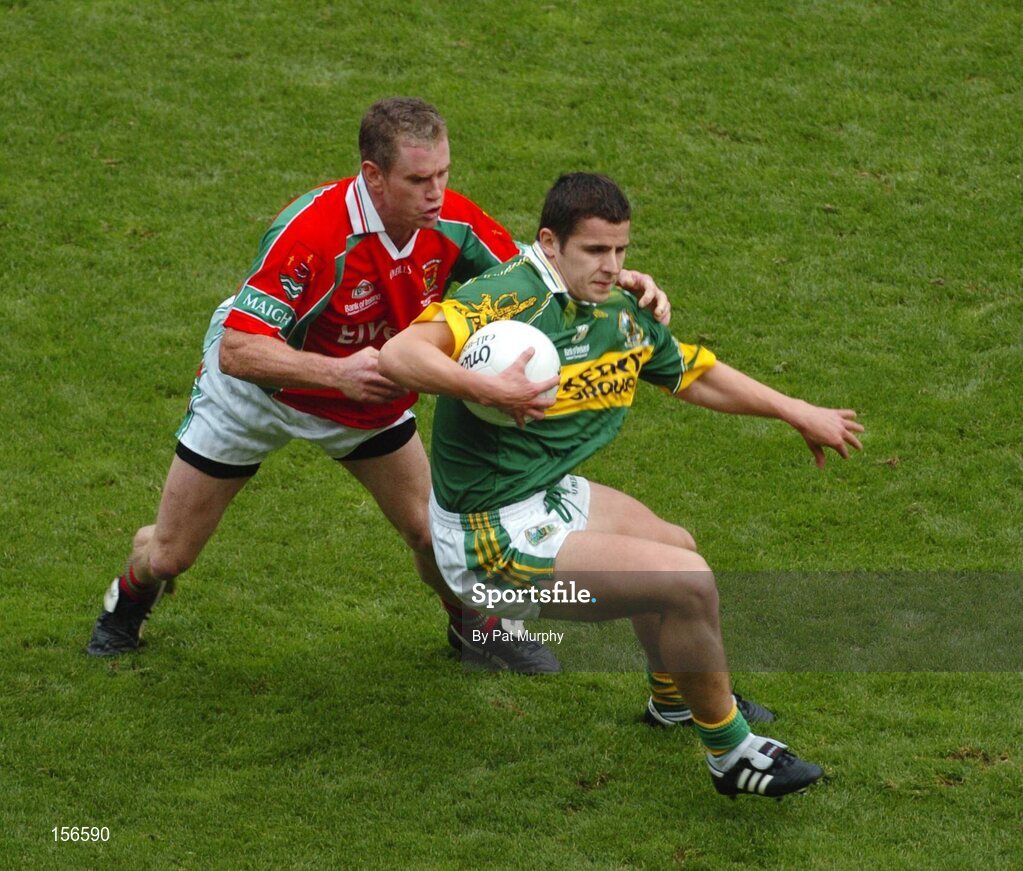 26 September 2004; Ronan O'Connor, Kerry, in action against Gary Ruane, Mayo. Bank of Ireland All-Ireland Senior Football Championship Final, Kerry v Mayo, Croke Park, Dublin. Picture credit; Pat Murphy / SPORTSFILE *** Local Caption *** Any photograph taken by SPORTSFILE during, or in connection with, the 2004 Bank of Ireland All-Ireland Senior Football Final which displays GAA logos or contains an image or part of an image of any GAA intellectual property, or, which contains images of a GAA player/players in their playing uniforms, may only be used for editorial and non-advertising purposes. Use of photographs for advertising, as posters or for purchase separately is strictly prohibited unless prior written approval has been obtained from the Gaelic Athletic Association.