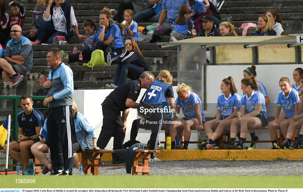 25 August 2018; Carla Rowe of Dublin is treated for an injury after being taken off during the TG4 All-Ireland Ladies Football Senior Championship Semi-Final match between Dublin and Galway at Dr Hyde Park in Roscommon. Photo by Piaras Ó Mídheach/Sportsfile