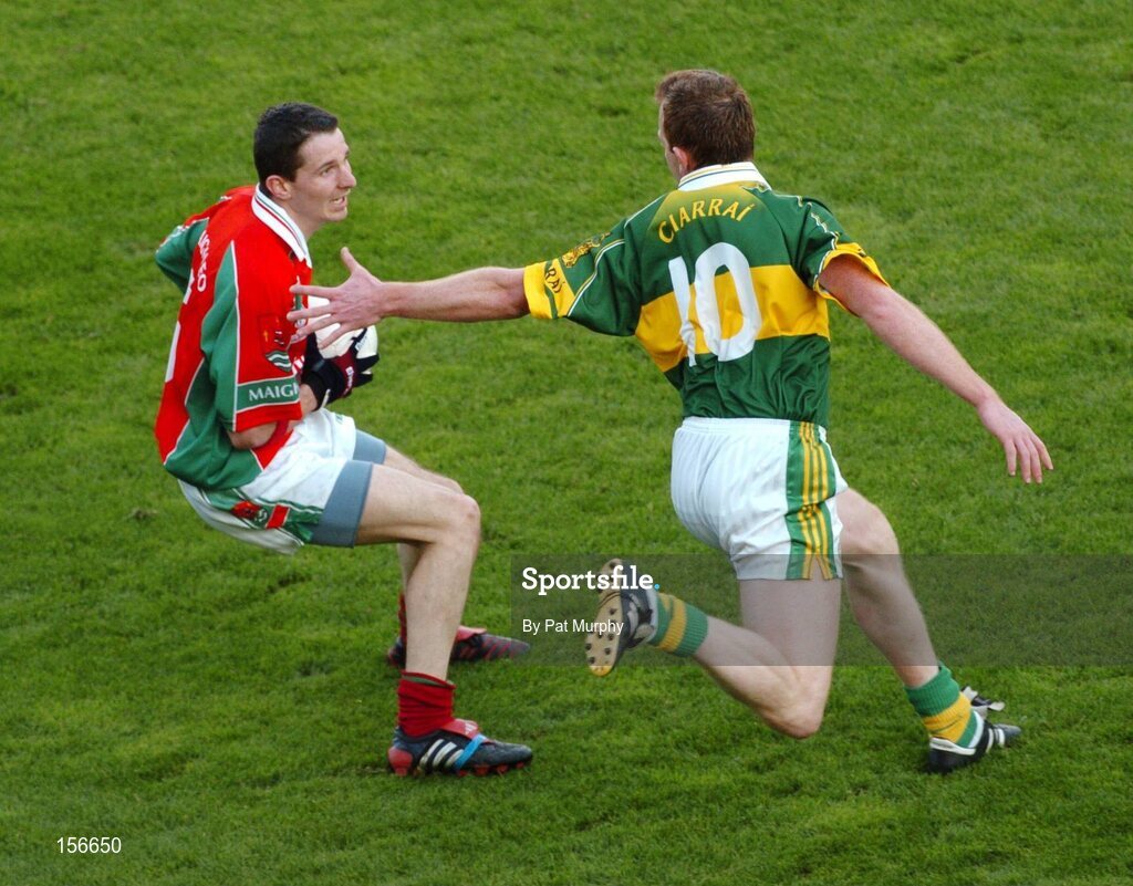 26 September 2004; Peader Gardiner, Mayo, in action against Liam Hassett, Kerry. Bank of Ireland All-Ireland Senior Football Championship Final, Kerry v Mayo, Croke Park, Dublin. Picture credit; Pat Murphy / SPORTSFILE *** Local Caption *** Any photograph taken by SPORTSFILE during, or in connection with, the 2004 Bank of Ireland All-Ireland Senior Football Final which displays GAA logos or contains an image or part of an image of any GAA intellectual property, or, which contains images of a GAA player/players in their playing uniforms, may only be used for editorial and non-advertising purposes. Use of photographs for advertising, as posters or for purchase separately is strictly prohibited unless prior written approval has been obtained from the Gaelic Athletic Association.