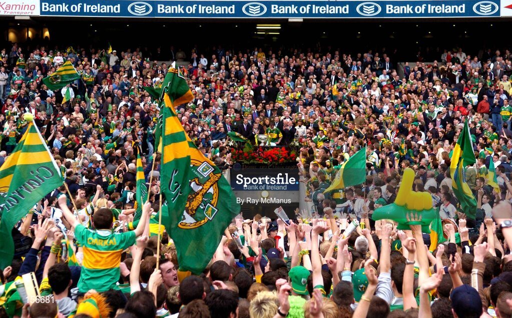 26 September 2004; Kerry fans celebrate as captain Dara O Cinneide prepares to lift the Sam Maguire cup. Bank of Ireland All-Ireland Senior Football Championship Final, Kerry v Mayo, Croke Park, Dublin. Picture credit; Ray McManus / SPORTSFILE *** Local Caption *** Any photograph taken by SPORTSFILE during, or in connection with, the 2004 Bank of Ireland All-Ireland Senior Football Final which displays GAA logos or contains an image or part of an image of any GAA intellectual property, or, which contains images of a GAA player/players in their playing uniforms, may only be used for editorial and non-advertising purposes. Use of photographs for advertising, as posters or for purchase separately is strictly prohibited unless prior written approval has been obtained from the Gaelic Athletic Association.