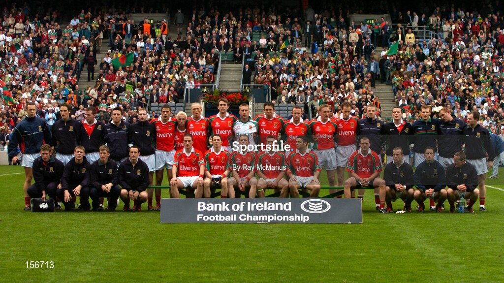 26 September 2004; The Mayo team. Bank of Ireland All-Ireland Senior Football Championship Final, Kerry v Mayo, Croke Park, Dublin. Picture credit; Ray McManus / SPORTSFILE *** Local Caption *** Any photograph taken by SPORTSFILE during, or in connection with, the 2004 Bank of Ireland All-Ireland Senior Football Final which displays GAA logos or contains an image or part of an image of any GAA intellectual property, or, which contains images of a GAA player/players in their playing uniforms, may only be used for editorial and non-advertising purposes. Use of photographs for advertising, as posters or for purchase separately is strictly prohibited unless prior written approval has been obtained from the Gaelic Athletic Association.