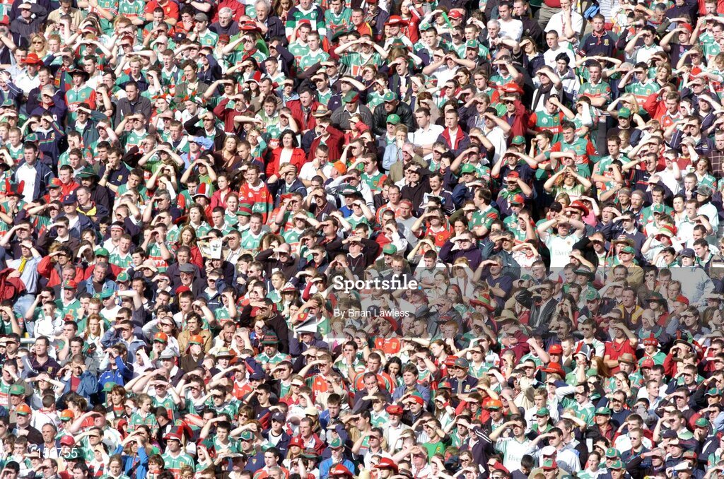 26 September 2004; Supporters on Hill 16 shield their eyes from the sun during the game. Bank of Ireland All-Ireland Senior Football Championship Final, Kerry v Mayo, Croke Park, Dublin. Picture credit; Brian Lawless / SPORTSFILE *** Local Caption *** Any photograph taken by SPORTSFILE during, or in connection with, the 2004 Bank of Ireland All-Ireland Senior Football Final which displays GAA logos or contains an image or part of an image of any GAA intellectual property, or, which contains images of a GAA player/players in their playing uniforms, may only be used for editorial and non-advertising purposes. Use of photographs for advertising, as posters or for purchase separately is strictly prohibited unless prior written approval has been obtained from the Gaelic Athletic Association.