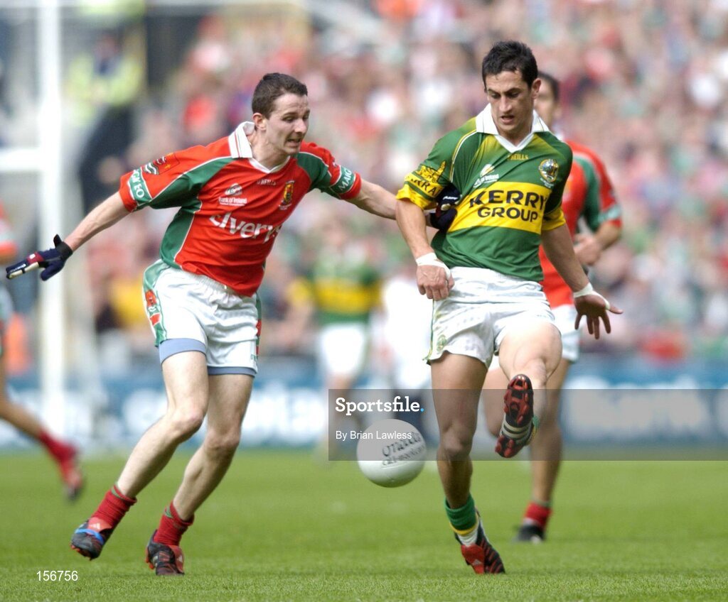 26 September 2004; Paul Galvin, Kerry, in action against Peadar Gardiner, Mayo. Bank of Ireland All-Ireland Senior Football Championship Final, Kerry v Mayo, Croke Park, Dublin. Picture credit; Brian Lawless / SPORTSFILE *** Local Caption *** Any photograph taken by SPORTSFILE during, or in connection with, the 2004 Bank of Ireland All-Ireland Senior Football Final which displays GAA logos or contains an image or part of an image of any GAA intellectual property, or, which contains images of a GAA player/players in their playing uniforms, may only be used for editorial and non-advertising purposes. Use of photographs for advertising, as posters or for purchase separately is strictly prohibited unless prior written approval has been obtained from the Gaelic Athletic Association.