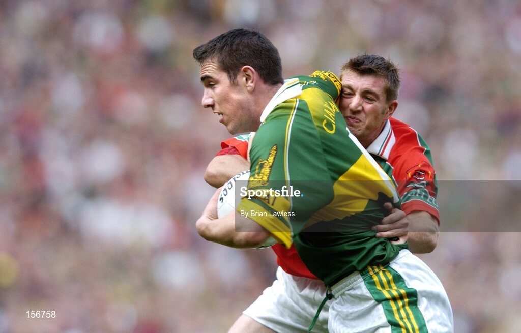 26 September 2004; Declan O'Sullivan, Kerry, in action against Dermot Geraghty, Mayo. Bank of Ireland All-Ireland Senior Football Championship Final, Kerry v Mayo, Croke Park, Dublin. Picture credit; Brian Lawless / SPORTSFILE *** Local Caption *** Any photograph taken by SPORTSFILE during, or in connection with, the 2004 Bank of Ireland All-Ireland Senior Football Final which displays GAA logos or contains an image or part of an image of any GAA intellectual property, or, which contains images of a GAA player/players in their playing uniforms, may only be used for editorial and non-advertising purposes. Use of photographs for advertising, as posters or for purchase separately is strictly prohibited unless prior written approval has been obtained from the Gaelic Athletic Association.