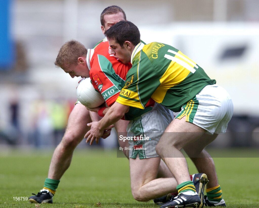 26 September 2004; David Heaney, Mayo, in action against Declan O'Sullivan (11) and Dara O'Cinneide, Kerry. Bank of Ireland All-Ireland Senior Football Championship Final, Kerry v Mayo, Croke Park, Dublin. Picture credit; Brian Lawless / SPORTSFILE *** Local Caption *** Any photograph taken by SPORTSFILE during, or in connection with, the 2004 Bank of Ireland All-Ireland Senior Football Final which displays GAA logos or contains an image or part of an image of any GAA intellectual property, or, which contains images of a GAA player/players in their playing uniforms, may only be used for editorial and non-advertising purposes. Use of photographs for advertising, as posters or for purchase separately is strictly prohibited unless prior written approval has been obtained from the Gaelic Athletic Association.