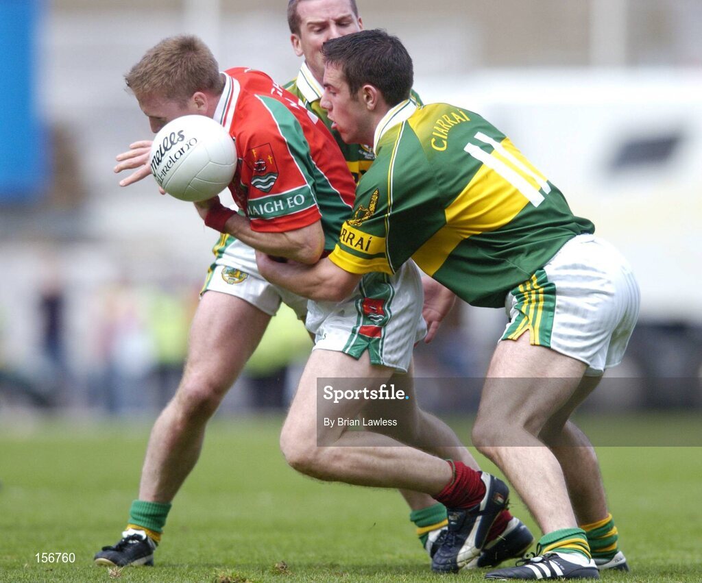 26 September 2004; David Heaney, Mayo, in action against Declan O'Sullivan (11) and Dara O'Cinneide, Kerry. Bank of Ireland All-Ireland Senior Football Championship Final, Kerry v Mayo, Croke Park, Dublin. Picture credit; Brian Lawless / SPORTSFILE *** Local Caption *** Any photograph taken by SPORTSFILE during, or in connection with, the 2004 Bank of Ireland All-Ireland Senior Football Final which displays GAA logos or contains an image or part of an image of any GAA intellectual property, or, which contains images of a GAA player/players in their playing uniforms, may only be used for editorial and non-advertising purposes. Use of photographs for advertising, as posters or for purchase separately is strictly prohibited unless prior written approval has been obtained from the Gaelic Athletic Association.