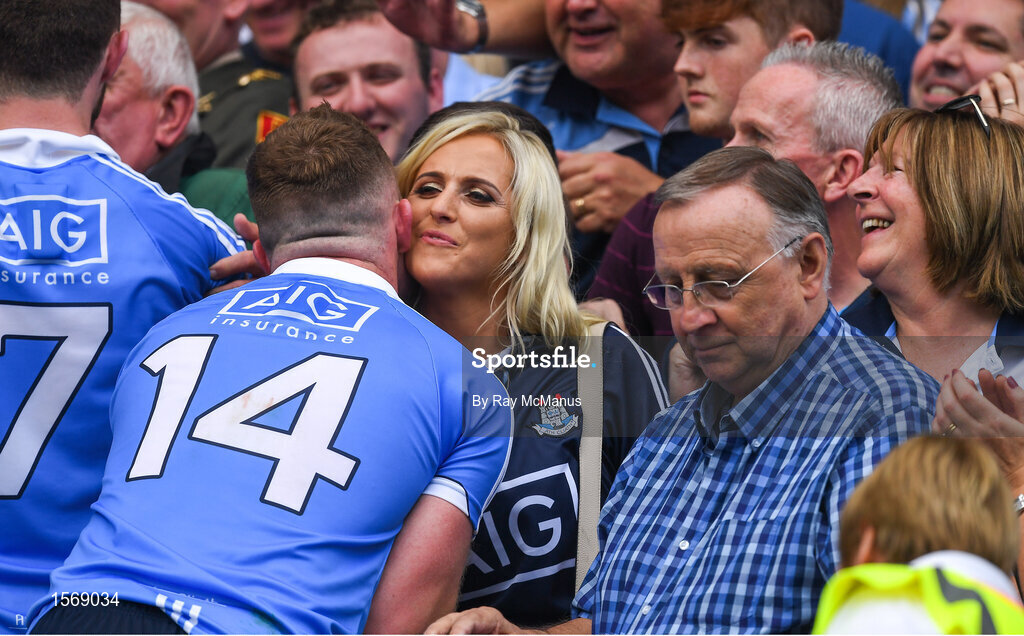 2 September 2018; Ciarán Kilkenny of Dublin is congratulated by Jo Cluxton, wife of captain Stephen, after the GAA Football All-Ireland Senior Championship Final match between Dublin and Tyrone at Croke Park in Dublin. Photo by Ray McManus/Sportsfile