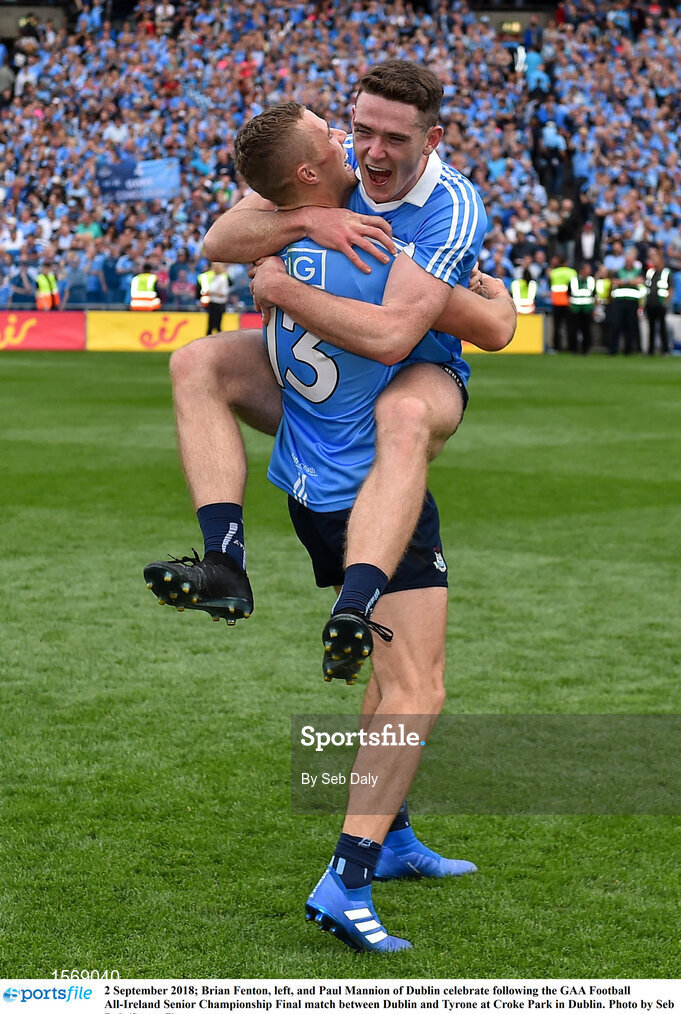 2 September 2018; Brian Fenton, left, and Paul Mannion of Dublin celebrate following the GAA Football All-Ireland Senior Championship Final match between Dublin and Tyrone at Croke Park in Dublin. Photo by Seb Daly/Sportsfile