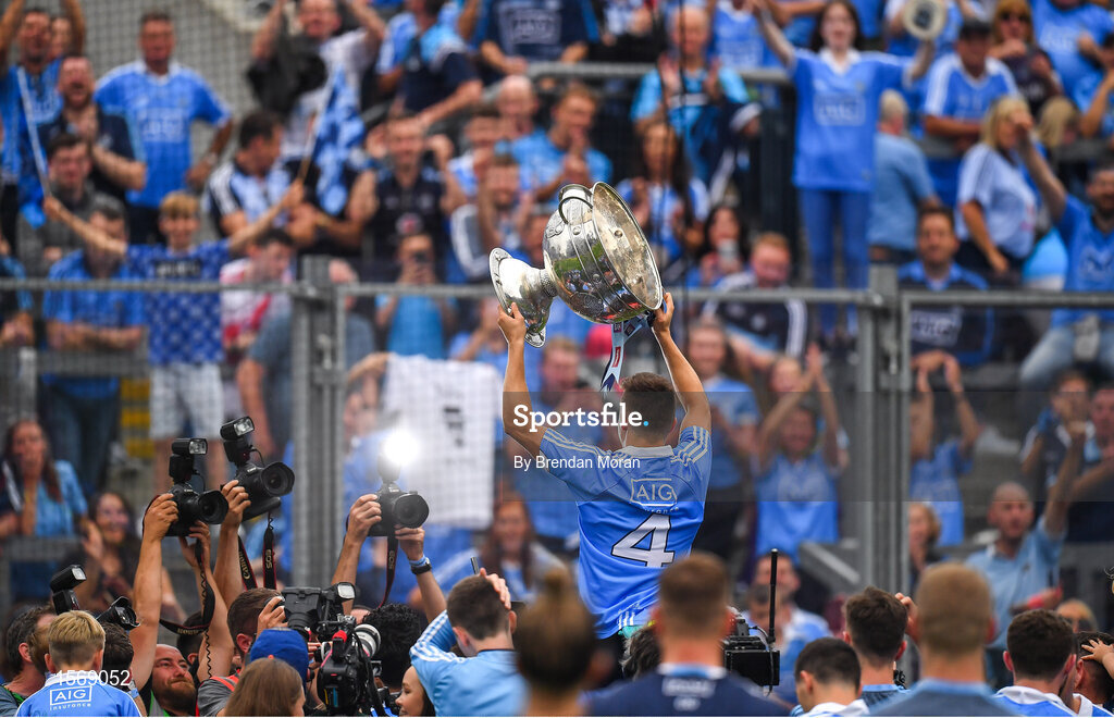 2 September 2018; Eoin Murchan of Dublin lifts the Sam Maguire Cup in front of Hill 16 after the GAA Football All-Ireland Senior Championship Final match between Dublin and Tyrone at Croke Park in Dublin. Photo by Brendan Moran/Sportsfile