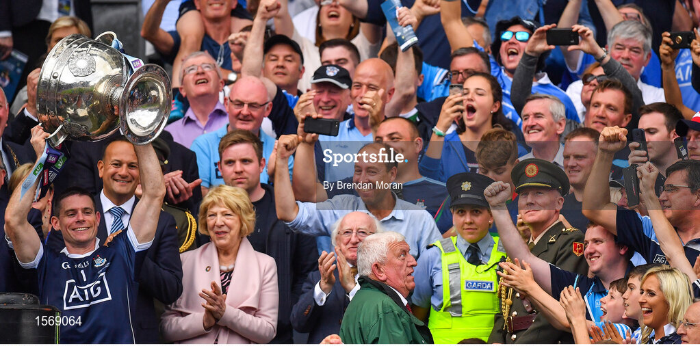 2 September 2018; Dublin captain Stephen Cluxton, watched by his wife Jo, bottom right, lifts the Sam Maguire Cup after the GAA Football All-Ireland Senior Championship Final match between Dublin and Tyrone at Croke Park in Dublin. Photo by Brendan Moran/Sportsfile