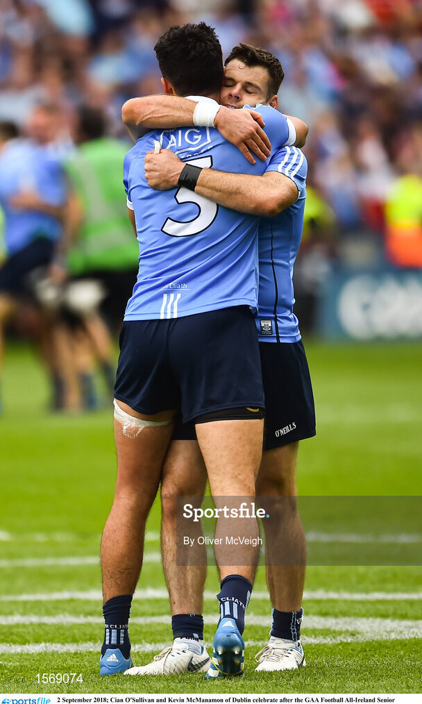 2 September 2018; Cian O'Sullivan and Kevin McManamon of Dublin celebrate after the GAA Football All-Ireland Senior Championship Final match between Tyrone and Dublin at Croke Park in Dublin. Photo by Oliver McVeigh/Sportsfile