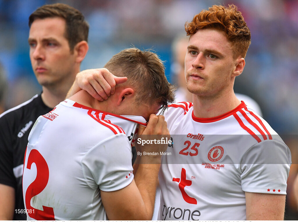 2 September 2018; A tearful Kieran McGeary of Tyrone is consoled by team-mate Conor Meyler after the GAA Football All-Ireland Senior Championship Final match between Dublin and Tyrone at Croke Park in Dublin. Photo by Brendan Moran/Sportsfile