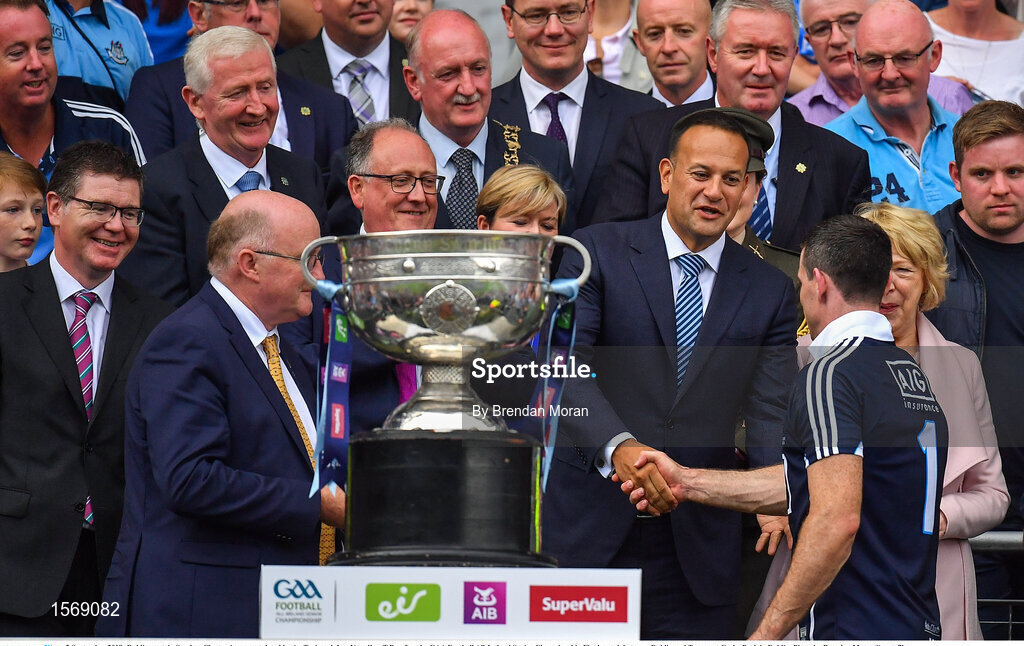 2 September 2018; Dublin captain Stephen Cluxton is ocngratulated by An Taoiseach Leo Varadkar T.D., after the GAA Football All-Ireland Senior Championship Final match between Dublin and Tyrone at Croke Park in Dublin. Photo by Brendan Moran/Sportsfile