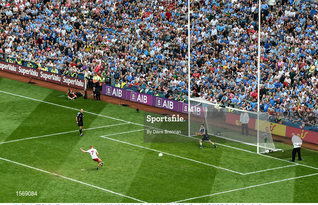 2 September 2018; Peter Harte of Tyrone scores his side's first goal during the GAA Football All-Ireland Senior Championship Final match between Dublin and Tyrone at Croke Park in Dublin. Photo by Daire Brennan/Sportsfile