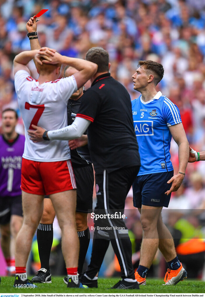 2 September 2018; John Small of Dublin is shown a red card by referee Conor Lane during the GAA Football All-Ireland Senior Championship Final match between Dublin and Tyrone at Croke Park in Dublin. Photo by Brendan Moran/Sportsfile