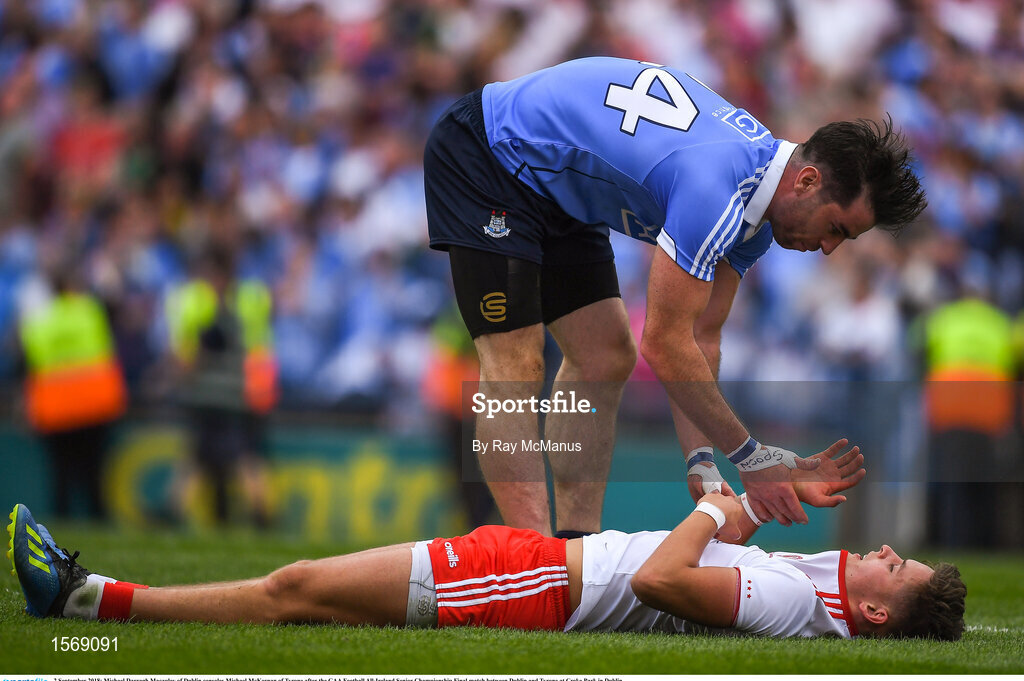2 September 2018; Michael Darragh Macauley of Dublin consoles Michael McKernan of Tyrone after the GAA Football All-Ireland Senior Championship Final match between Dublin and Tyrone at Croke Park in Dublin. Photo by Ray McManus/Sportsfile