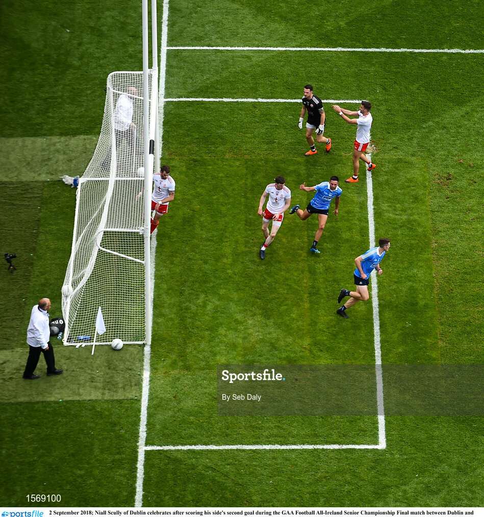 2 September 2018; Niall Scully of Dublin celebrates after scoring his side's second goal during the GAA Football All-Ireland Senior Championship Final match between Dublin and Tyrone at Croke Park in Dublin. Photo by Seb Daly/Sportsfile